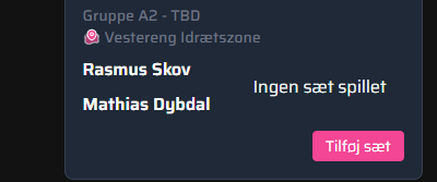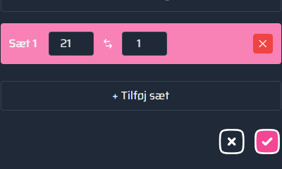 Klik på "Tilføj sæt" og indtast sætresultatet. Tilføj flere sæt ved klik på "Tilføj sæt". Afslut og gem ved tryk på fluebenet.